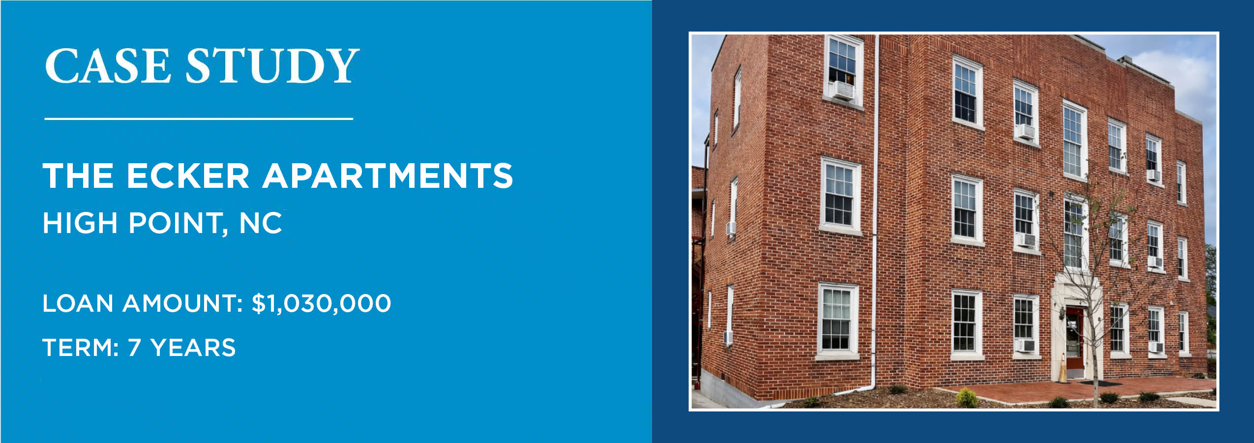 The Ecker Apartments is a multifamily property in High Point, North Carolina, a core Piedmont Triad market supported by manufacturing, logistics, and healthcare employment. The area continues to benefit from consistent workforce housing demand and stable renter turnover. The asset fit cleanly within lender expectations for the market, and the objective was straightforward: refinance the property while maintaining loan proceeds and securing predictable debt service.